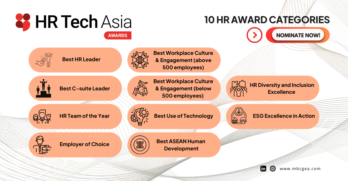 The HR Tech Asia Awards 2025 celebrates the outstanding achievements of the region’s top HR leaders, companies, and teams. We are excited to announce that nominations are now open. Eligible entrants include Asia-based employers from both the private and public sectors, encompassing MNCs, local companies, government agencies, SMEs, and more.