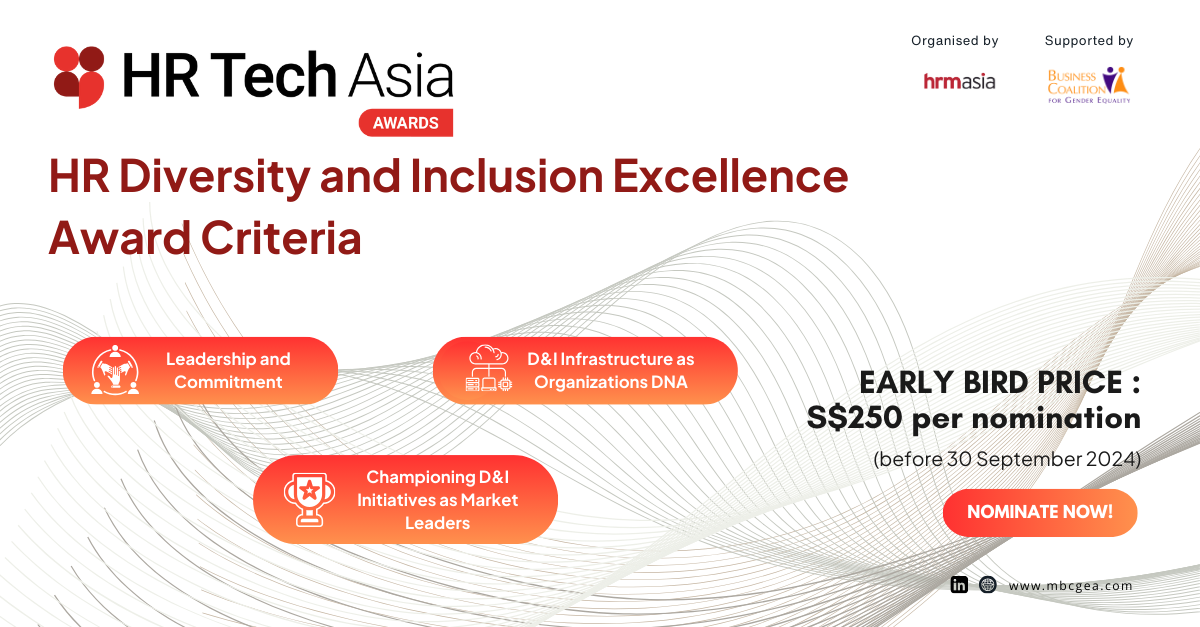 BCGE proudly presents the HR D&I Excellence Award 2025, in collaboration with HRM Asia, as part of the esteemed HR Tech Asia Awards 2025. This prestigious award honors organisations that have excelled in diversity and inclusion (D&I) across their infrastructure, practices, and culture. Nominations are now open to Asia-based employers from both the private and public sectors: international companies, local companies, government agencies, and SMEs. Early bird nominations are accepted until 30 September 2024, at a fee of SGD$250, with regular rates applying thereafter. The deadline for submissions is 15 January 2025. The winners will be celebrated at the HR Tech Asia Awards 2025 on 6 May 2025, at the Suntec Singapore Convention & Exhibition Centre.