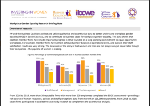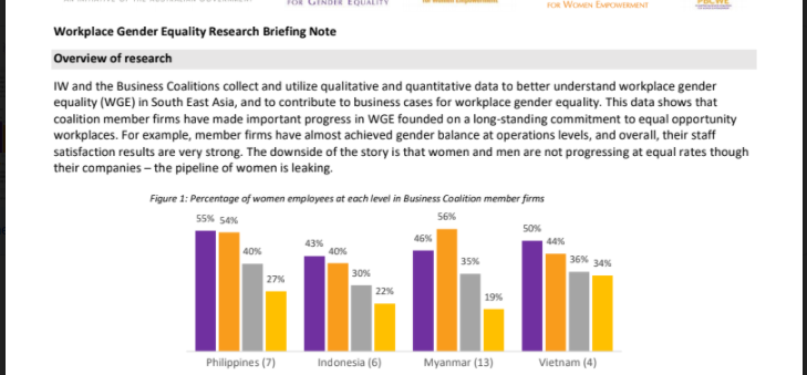 Investing in Women and the Business Coalitions – the Phillippines, Indonesia, Myanmar and Vietnam – collect and utilize qualitative and quantitative data to better understand workplace gender equality (WGE) in South East Asia, and to contribute to business cases for workplace gender equality. This data shows that coalition member firms have made important progress in WGE founded on a long-standing commitment to equal opportunity workplaces.